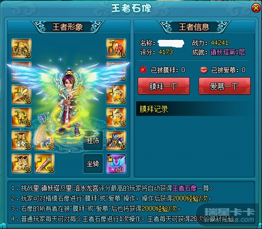 每人每天只能对同一位王者膜拜1次。最多可膜拜6位王者。3.
