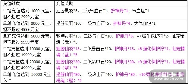 玩家若在【商城】、【仙境寻宝】、【神秘商店】及【天官赐福】消费满50000元宝,即可获得以上消费额度的所有奖励。温馨提示:以上奖励均为绑定物品,奖励以信函方式发放。四、
