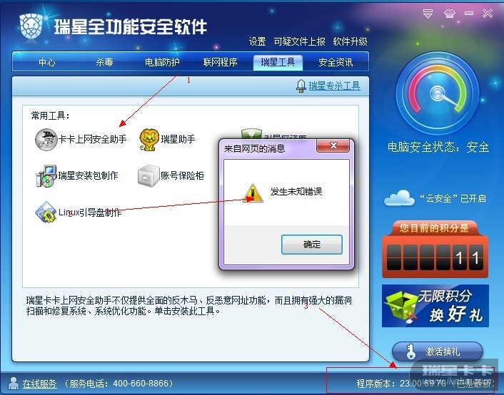 问题比较多 往工程师耐心看看 很真实现实的问题 不明白的可以楼下回复我或者联系我QQ531938611 如截图所明 点击 卡卡上网安全助手弹出发生未知错误 还有后面一个瑞星助手点击了也没用 没有任何反映之前安装的 瑞星杀毒软件2011 也是这样的情况 还有我想问下 瑞星杀毒软件2011&瑞星全功能安全软件2011到底有什么区别?我安装起瑞星杀毒软件2011的时候安装 瑞星全功能安全软件提示以安装瑞星杀毒软件2011 提示请卸载瑞星杀毒软件2011 款软件只能用一款我知道 2款的区别在哪里呢?我没发现哪里不一样 全功能的就多了一个 中心和 一个联网程序2个界面,还有我记得安装起瑞星 无法安装快播软件 但是我今天打开快播时直接死机重启了而不是打不开快播播放器 之前我用的时候都是点击播放器无反映这次怎么死机重启了呢?本机使用的是win7旗舰版用户系统信息:Mozilla/5.0 (compatible; MSIE 9.0; QDesk 2.3.1185.202; Windows NT 6.1; Trident/5.0; 360SE)附件: