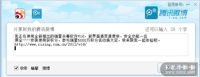 在试用瑞星的时候,看见“微博推荐”的字样,何不做成类似于酷狗分享按钮。(如图所示)