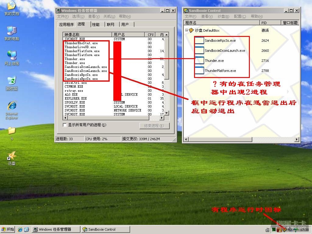 先在沙盘中运行迅雷:(竟然有些进程是2个,不明白)(仅以迅雷为例,其他很多软件都类似 PotPlayer、KMPlayer3都有类似问题。)