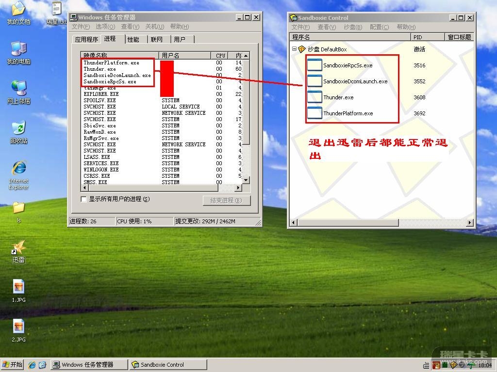 2、退出迅雷情况:沙盘中已没有程序运行,但任务管理器还有,注销系统后运行的程序也不能退出只有重新启动。如果没有重新启动再次运行就有的进程是3个了。