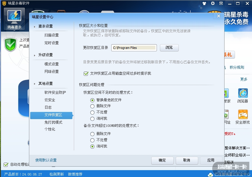 升级到最新版本, 试验了一下文件恢复区的设置。