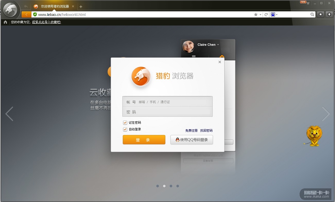 在试用瑞星浏览器的时候,希望开发一个类似于猎豹浏览器账号的功能,并互通账号。(如图所示)
