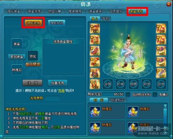 级及以上的橙色装备才可以进行神佑(3)只有武器、戒指、护符、防具可以拥有神佑属性(4)生成与洗炼神佑属性的必要道具是转魂石,升级则需要神佑石 2.