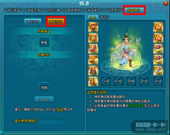 )玩家达到68级时锻造界面会开启装备神佑功能(2)必须是70
