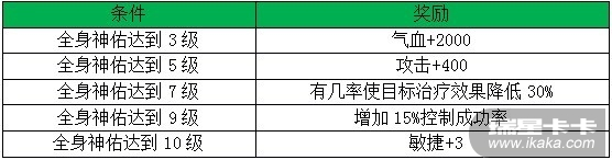 神佑特殊奖励当全身神佑属性等级满足一定条件时,会有特殊的属性奖励,具体如下: