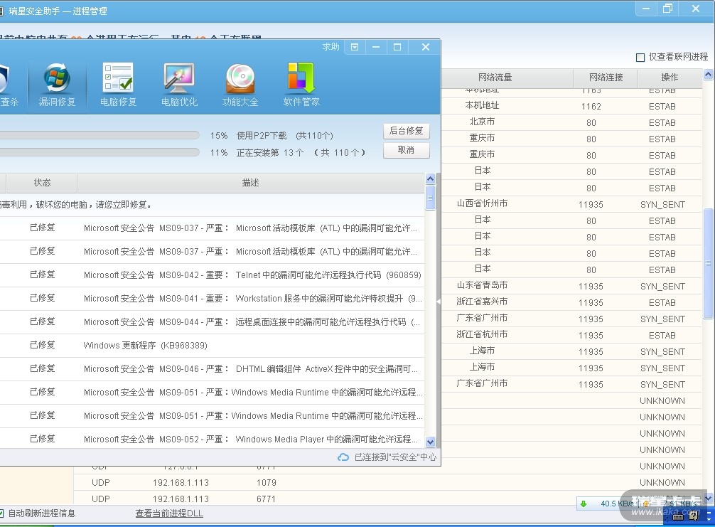 个补丁 我是自己有光盘 常常装系统 上次发现这个情况后 修复补丁前 我会打开 助手的进程管理