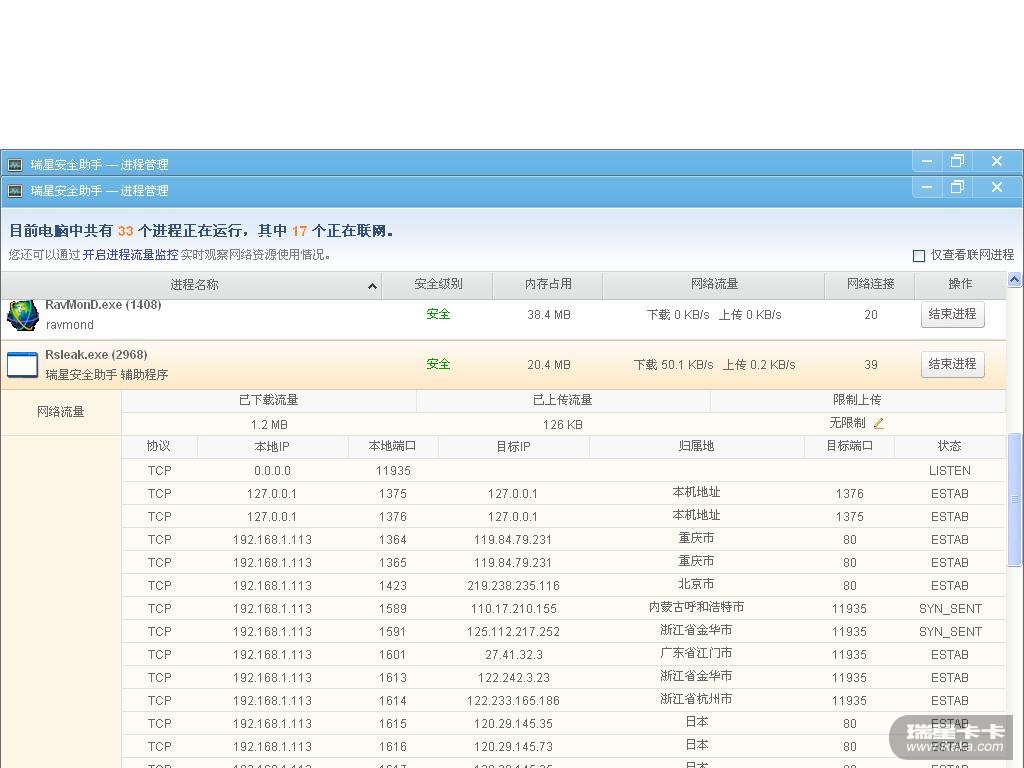 下文件夹(sys)里面的内容 还是一样卡 瑞星助手的老毛病了(需要卸载在重新安装) 打开进程一看 还