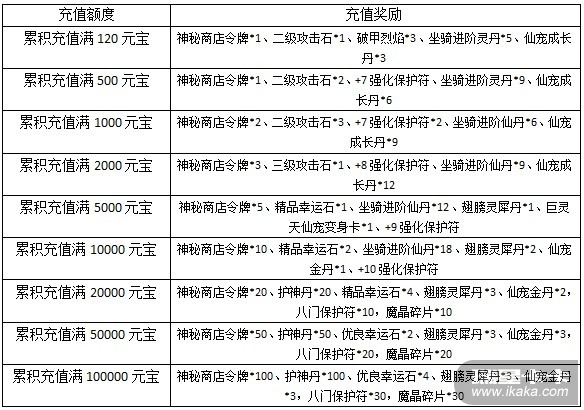 温馨提示:不同充值额度奖励可累积获得,奖励以信函方式发放,均为绑定。巨灵天仙宠变身卡可永久加仙宠的5点成长,仙宠金丹使用之后将直接提升仙宠潜力值及潜力上限值,翅膀灵犀丹使用之后,将增加翅膀的百分比属性,翅膀阶数越高,效果越明显哦。二、 消费有礼,倾情回馈活动时间:2012