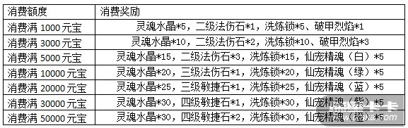 玩家若在【商城】、【仙境寻宝】及【神秘商店】消费满50000元宝,即可获得以上消费额度的所有奖励。温馨提示:以上奖励均为绑定物品,奖励在活动面板进行领取。三、 元神提升,神丹护航活动时间:2012