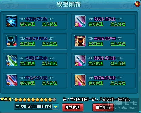 批量刷新能够快速获得幸运值,幸运值越高出现高品质神通的几率更高