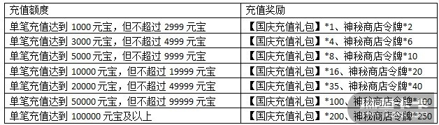 国庆首充大礼活动期间,所有玩家首次进行任意金额的充值即可获得我们送出的价值688
