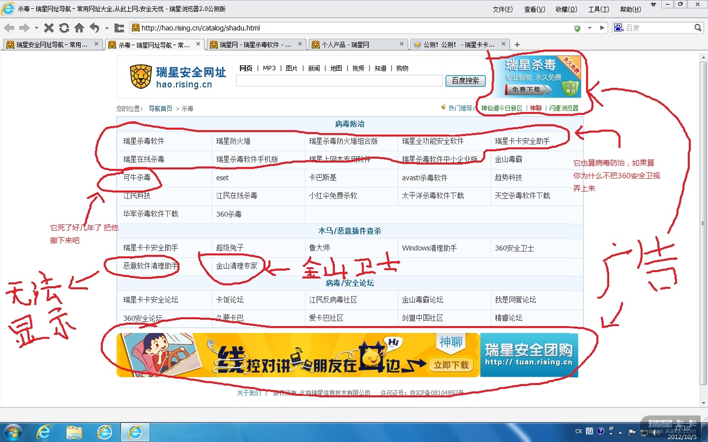 瑞星2012公测了快一年了 又出来个v16版的又在公测 瑞星防火墙2012也在公测 瑞星安全助手公测了一年多了 还在公测 而且没有几个实用的功能(电脑门诊等) 还有你们说他干净 我觉得不干净 界面上广告满天飞 还有瑞星保险柜5.0公测了二年多了 公测到什么时候是个头 快一年没更新了 浏览器也在公测 瑞星软件管家和加密盘没更新过 瑞星安全游戏只不过是你们赚钱的工具罢了 还有瑞星杀毒更新的时候会让你安装瑞星浏览器 更改首页 你们想钱想疯了吗 你们看看你们的安全网址 广告 满满的 看看杀毒中的病毒防治你们的就占了两行,这样管用吗:kaka10: 瑞星啊瑞星啊 免费了就不行了
