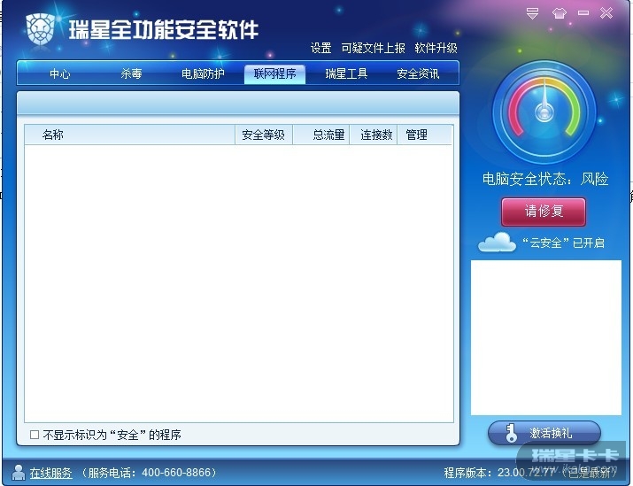 电脑刚启动后马上点出瑞星全功能安全软件,点进“联网程序”里,还可以看到使用网络的进程等,但过几秒后马上就消失了,变成一片空白,求解答啊。已经全盘杀毒,没有病毒或者木马。