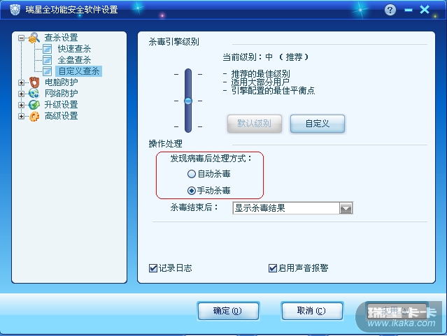 请将查杀级别调为默认(中)级别,并将发现病毒后处理方式改为手动杀毒,观察是哪个文件反复查杀反复报毒。