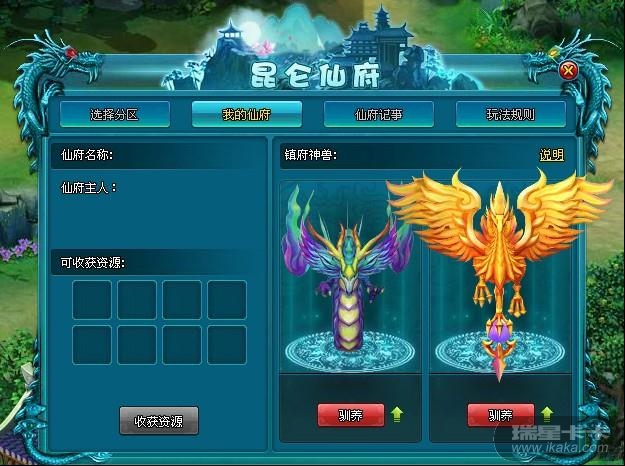 仙府主人可以在“我的仙府”界面中驯养镇府神兽,在有人争夺和打劫自己的仙府时镇府神兽能够协助主人战斗。(可以通过消耗元宝提升镇府神兽的等级,提高神兽的战斗能力)7、