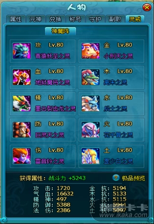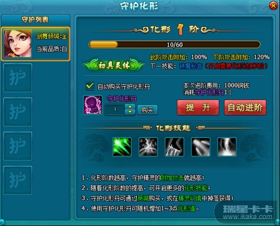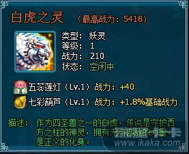 http://bbs.ikaka.com/showtopic-9194378.aspx二.精灵守护化形功能概述:精灵乃天地间至灵之物,相传经过百年启蒙、千年化形,精灵将获得不可思议的能力,化形后的精灵可以在战斗中现身,并给敌方造成伤害或附加不良状态,所以化形精灵已变成修仙之人梦寐以求的,增强实力的宝物。相传世间有一种使精灵化形时间缩短的天地奇物-