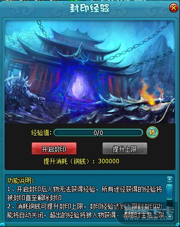 经验封印有上限,上限可通过消耗游戏币提升,特别提醒:当获得的经验超出封印上限时,封印功能自动关闭,并且超出的那部分经验将被人物获得,所以广大玩家请随时留意上限情况,避免不必要的损失。5、