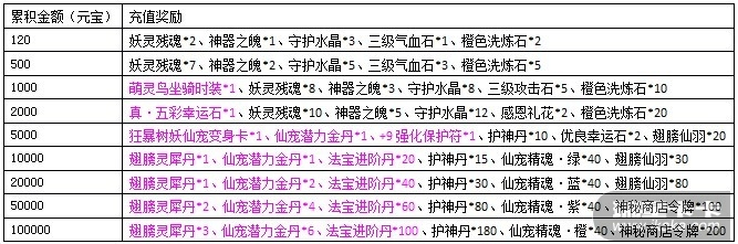 首充大礼活动期间,所有玩家首次进行任意金额的充值,即可获得价值688元宝的【感恩节首充礼包】(奖励每人只能领取一次哦,未进行过首充的玩家还可额外获得【首充礼盒】哦)【感恩节首充礼包】打开可获得精品幸运石*1、守护水晶*3、仙宠成长丹*3、四级淬炼石*1、妖灵残魂*3、鲜花99朵*1。2、