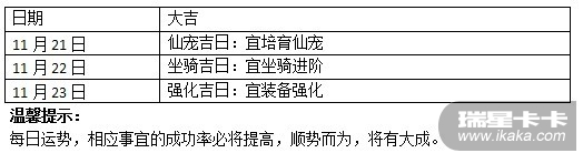 年11月21日08:00至11月23日23:59活动范围:全服活动规则:活动期间,为回馈广大仙友,每日将会有大吉运势,玩家若在当日进行相应的能力提升,将如有神助,水到渠成。每日运势预测如下: