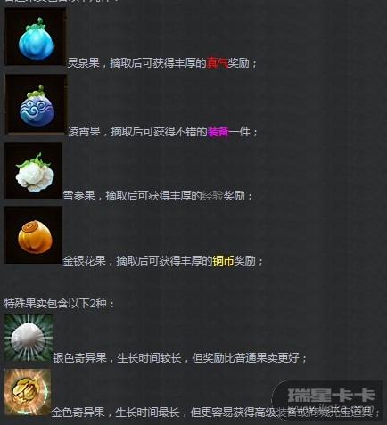 普通果实随机长出,且成熟快,可以通过仙露浇灌缩短成长时间。能够给玩家带来各种强大的装备和道具;