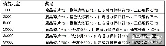 玩家若在指定系统消费满50000元宝,即可获得以上消费额度的所有奖励。