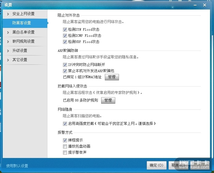 由于中国的实际互联网环境和西方国家的互联网环境的先天差别,实际上,国内用户面临的最大威胁还是网络钓鱼与欺诈。在应对这点上,瑞星防火墙做得十分不错,可以在安全上网的设置中,对电脑上的浏览器进行高强度的防护,具体的原理我不是很清楚,但目测貌似设置后的浏览器的所有流量会让瑞星防火墙过滤一遍,相信安全性还是比较有保障的。而且貌似瑞星防火墙的钓鱼网址库也基本是个几天就给更新一次的。