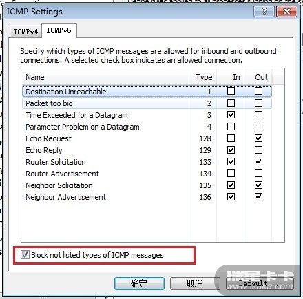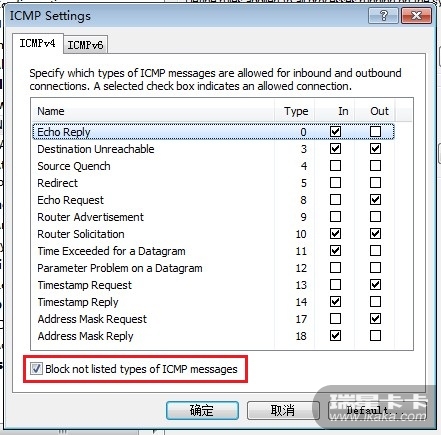 (2)在对ICMP协议的过滤方面,二者的能力基本上是相同的,但outpost更为直观,方便二者都能够为每一种ICMP类型的数据包制定规则,差别是,瑞星将对ICMP协议过滤规则设置在了全局规则——即IP规则内,而OP将ICMP协议过滤拿到了全局规则以外,单独设置了一个ICMP协议规则,并且默认阻止除了指定选取的规则以外的数据包,此外,由于OP支持IPv6,其ICMP协议过滤也对ICMPv6协议设置了过滤规则。这点上,outpost防火墙更好一点。