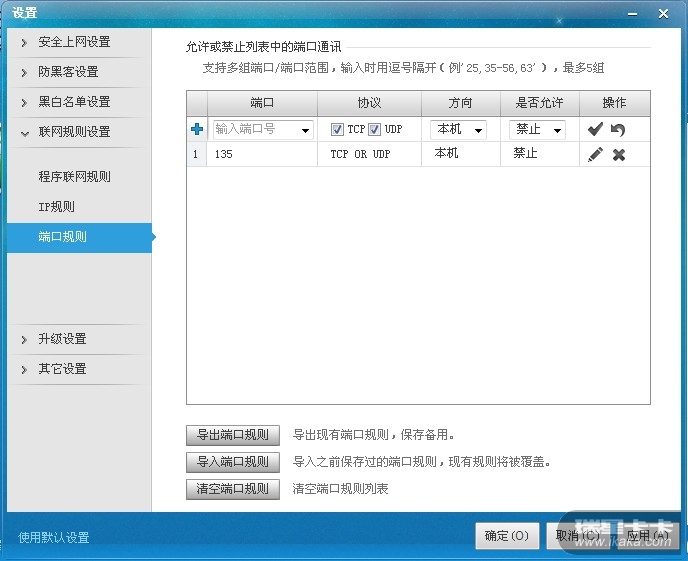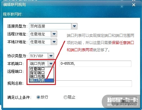 5. 在IP规则和联网程序规则中,去掉“指定端口”和“端口范围”两个选项,因为“端口列表”已经可以极为方便快捷的实现这两个选项的功能,完全没必要把这两个选项单独拿出来。希望改进这项。