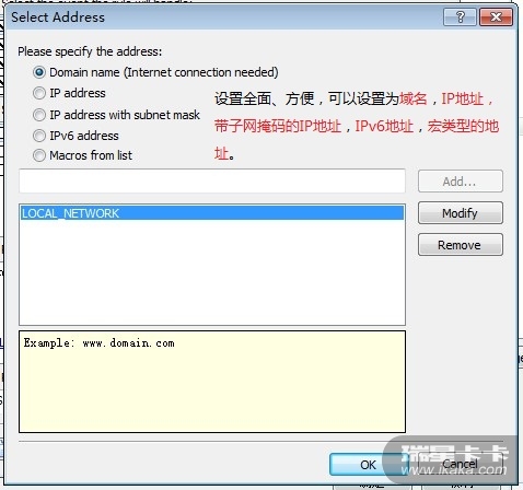 然而,在设置具体的程序规则方面,OP明显比瑞星更为方便。二者的程序规则设置中,都可以控制本地端口、远程端口、远程IP(瑞星多一个设置本地IP地址的选项,但个人看不出其有什么意义),并且端口均可以设置为“端口列表”的形式(这点上,个人认为,由于端口列表可以方便的实现“指定端口”和“端口范围”两项的功能,故瑞星的“指定端口”和“端口范围”这两项显得有些多余,完全可以去掉),但是在远程IP和本地IP两项上边,瑞星显然做得很糟糕,只有“任意地址”和“地址范围”两项,相比而言,outpost防火墙的地址设置就是一个列表,列表中可以添加:域名,IP地址,带子网掩码的IP地址,IPv6地址,和地址宏(个人认为地址宏这项非常出彩)。outpost的列表形式的地址访问设置较为方便,希望瑞星能借鉴一下。