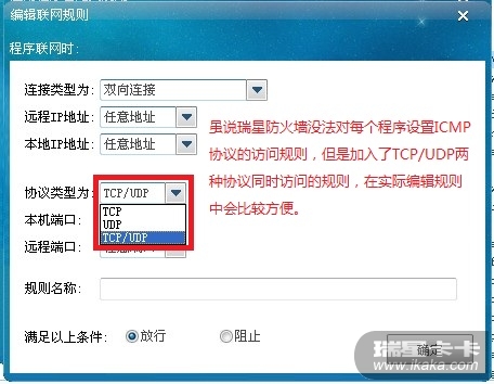 在具体的程序联网规则的通信协议选择上,outpost可以设置每个程序对于ICMPv4和ICMPv6协议的访问规则,瑞星无此项功能;而瑞星在TCP、UDP两种访问协议外,加入了同时访问两种协议的TCP/UDP,这点虽说看似普通,但实际编辑程序联网规则中,十分方便,同样一条规则,outpost需要对TCP、UDP协议分别设置,但瑞星一条规则就搞定了。