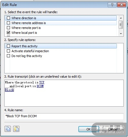 (4)禁止端口通信方面,瑞星远比outpost方便。outpost的端口禁止访问只能在全局规则中通过分别设置禁止所有TCP、UDP协议的数据通过本地某个端口来曲线救国;而对于瑞星防火墙,只需要在端口规则里边禁止某个端口就行了。