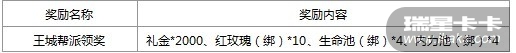 活动内容:活动期间,首次在王城争霸中获得胜利的帮派成员均可获得神秘大礼一份。