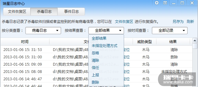 1、瑞星的白名单能增加一个清空按钮吗? 里面的文件多了一个个删除是很累的。2、既然是安全软件,建议增加痕迹删除工具。不等同于删除顽固文件。而是对用户剩余空间、已删除的文件文件名进行痕迹擦除,保护用户隐私。这个可做入VIP功能中。(不仅仅是用户浏览记录等那么简单了)3、查杀结果能点击文件名、病毒名、操作列名进行排序,以方便用户快速检索到查杀失败的文件。