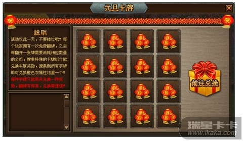 在元旦当天,(仅次一天)大家可以开启16张圣诞卡牌,在这16张圣诞卡牌中藏有8张带字的卡牌,它们分别是“三”、“国”、“演”、“义”、“元”、“旦”、“快”、“乐”,只要凑齐“三国演义元旦快乐”将能够获得橙色将星“舜”!其强力的命中和识破加成给吕布之流装备后,必将成为您驰骋三国疆场的一大强力战将!