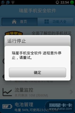 重新安装也是出现以下问题,请核实解决!瑞星手机软件版本为:瑞星官网首页下载的最新版,手机型号为天语E619.1、电池管理功能无法使用。界面提示:进程意外停止,请重试!2、流量校准,短信矫正,没有中国电信。