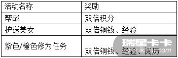 年01月05日00:00至01月06日23:59活动范围:全服活动规则:活动期间,参加相应的活动可获得相应的双倍奖励。
