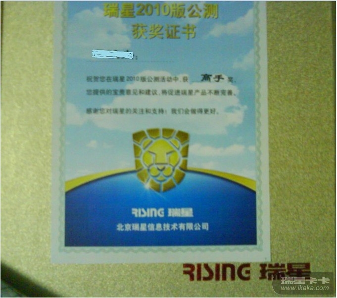 从05年的时候就开始用瑞星了,到现在还在继续用着,用下来感觉不错,后来参加过很多瑞星公测活动,记得参加过瑞星08版的一次内测活动 得到了一个霸王狮 08版杀毒软件盒装 奖牌,还有10版的公测