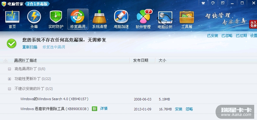 qq管家没发现漏洞,但瑞星安全助手(还有金山卫士)报了好几个,有高危,有重要,点击修复,qq管家却建议不安装,说有的过期了,有的不适合,我该听谁的?