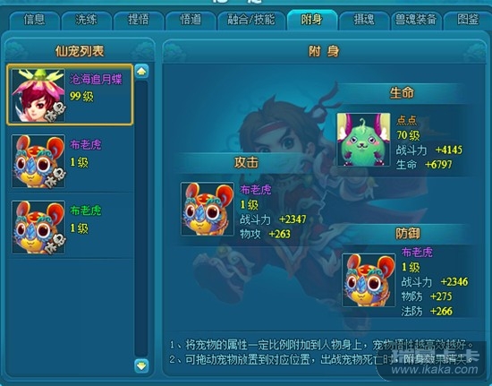 2)属性加成效果:宠物附身提供的属性加成,主要根据宠物自身属性及悟性来决定。