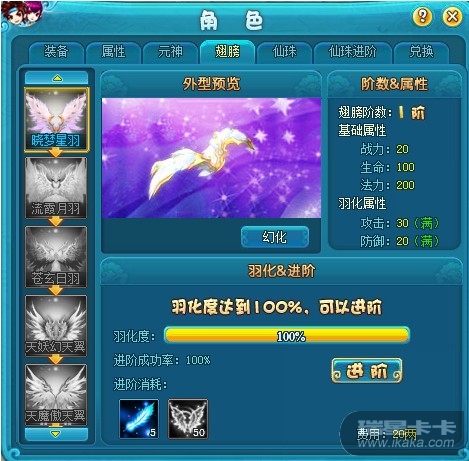 2)翅膀羽化:羽化能增加攻击和防御,每次羽化需消耗一个【羽化水晶】,羽化会有一定概率失败。