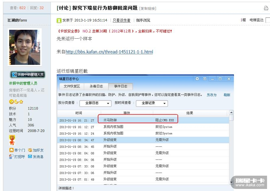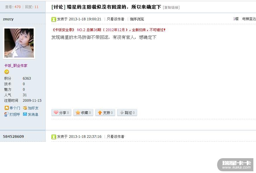 想问一下瑞星2012和2011的木马行为防御有没有加入回滚,希望美女瑞星工程师12mm进来解答一下