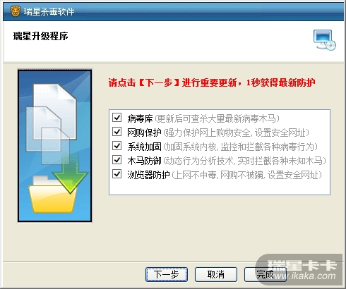 这个升级弹窗是提示您是否设置瑞星安全网址为首页,如果不想设置,请将网购保护、浏览器防护这两项取消勾选,再点击下一步。