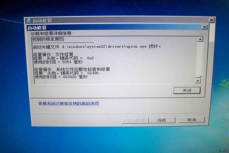 在昨天中午刚出现问题的时候,我也是手忙脚乱,头脑里乱猜是怎么回事,后来仔细查看WIN7的启动恢复的详细报告里,提到了这个文件spoon.sys,于是就立即把硬盘拆出来,通过E-SATA线充当移动盘,接到另一台机器上,查看这个文件,然后将这个文件剪切到了U盘上,原来SYSTEM32\Drivers\下就没这个文件了,将硬盘接回到原来的机器上面,发现能够正常启动了。