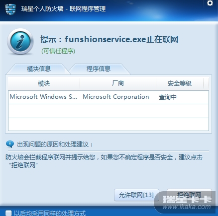 您可以在程序联网规则中设置是否允许funshionservice.exe联网。