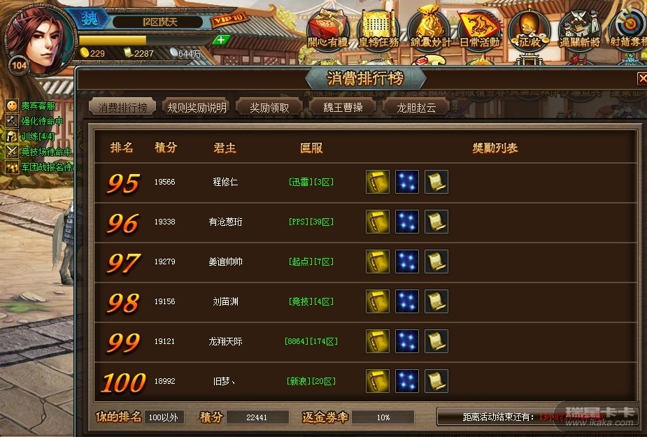 约上午11点时我消费22441积分,第一百名显示消费18992积分,因为这个搞笑的显示,我就去忙别的了,前两次跨服12点我都在100内。
