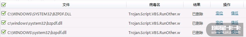 每次全盘查杀时,总能在C:\WINDOWS\system32\bzpdf.dll处查到木马,处理原因是:Trojan.Script.VBS.RunOther.w