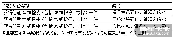 活动期间,玩家通过橙装精炼获得任意一件橙装(包括橙色武器),即可获得系统奖励一份,活动可重复参与。