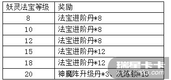 活动期间,将灵戒洞天里任意妖灵法宝等级提升到指定等级,可获得额外系统赠礼。